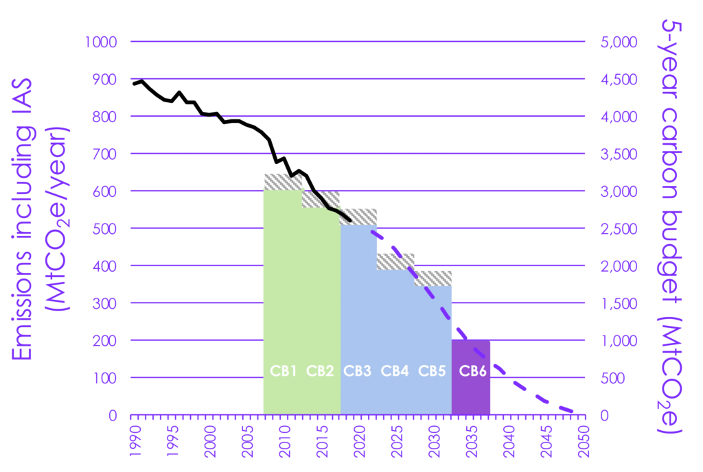 The government is legally bound into its “Carbon Budgets” and has recently passed the 6th Carbon Budget into law. Looking at the graph beside, the firm line shows the carbon emission drop that has already happened. The dotted line is the pathway we need to be on in order to hit the legally binding targets. In very basic terms the drop you can see has come from the decarbonisation of the power sector (producing electricity). This has been achieved by turning off the coal fired power stations and the deployment of renewables.